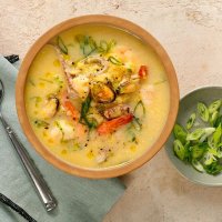 Суп с морским коктейлем, кукурузой и креветками