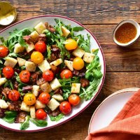 Зелёный салат с беконом и быстро обжаренными помидорами