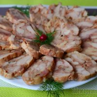 Рулет из цесарки с чеддером и вялеными томатами под соусом