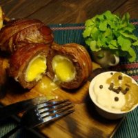 Яйцо-scotch в коконе на гриль-доске в можжевеловом дымке