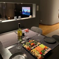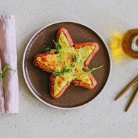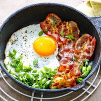 Яичница с шампиньонами, сыром, маслинами и тостом