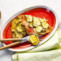 Морской окунь, запечённый с цукини в апельсиновом соусе