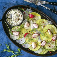 Салат из редиски, дайкона и редьки с сырным соусом