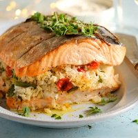 Форель, фаршированная рисом, овощами и травами