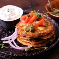 Картофельные оладьи с солёной форелью