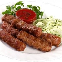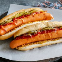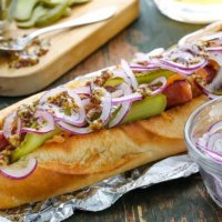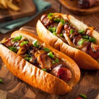 Хот-доги с картофельным пюре, копчеными колбасками и луком