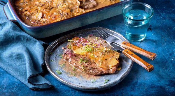 Описание: ✅ Отбивные из говядины - под золотистой «черепицей» из картофеляНарядное, очень праздничное блюдо: большие, слегка отбитые молотком, ломти мяса величиной почти с ладонь и толщиной 1,5 см, а поверх — тонкие пластинки картофеля и карамелизованный лук. Кстати, последний играет в этом блюде далеко не последнюю роль: к пассерованным в сливочном масле перьям мы добавим ароматные семена сельдерея, сушеный тимьян, немного куриного бульона, молока и нарезанную петрушку — все компоненты соединим в однородную массу и под этим луково-сливочным топингом запечем наше блюдо. Для 6 порций нужно: ◆ 6 ломтей говядины (не для тушения)◆ 4–5 шт. небольшого картофеля◆ 5 ст. л. сливочного масла◆ 1 большая луковица◆ 3 ст. л. пшеничной муки◆ ½ ч. ложки семян сельдерея◆ 5–6 стеблей петрушки◆ 2–3 веточки тимьяна◆ ¾ стакана молока◆ 1 стакан куриного бульона◆ соль - по вкусу◆ черный молотый перец - по вкусуГотовка: 1 ч 30 мин▶ Для приготовления отбивных из говядины сначала нарежьте лук перышками, духовку включите на разогрев до 180 градусов.▶ Мясо слегка отбейте молотком и приправьте солью и перцем.▶ Разогрейте на сковороде 2 ст. ложки сливочного масла и обжарьте отбивные до румяной корочки. Переложите в тарелку и накройте фольгой.▶ Добавьте в сковороду еще 2 ст. ложки сливочного масла и нарезанный перьями лук. Пассеруйте до мягкости лука.▶ Добавьте муку, перемешайте и готовьте 1 минуту. Посолите, поперчите, добавьте семена сельдерея, тимьян, куриный бульон, молоко и нарезанную петрушку.▶ Доведите до закипания и добавьте еще 1 ст. ложку сливочного масла. Перемешайте и снимите с огня.▶ Очищенный картофель нарежьте очень тонкими кружочками. Совет. Можно для нарезки использовать терку-мандолину▶ Смажьте форму для запекания маслом, уложите отбивные и поверх них – плотной черепицей положите нарезанный картофель.▶ Сверху картофель полейте луковым соусом.▶ Накройте отбивные с черепицей из картофеля фольгой и запекайте 45 минут.▶ Снимите фольгу и запекайте еще 30 минут до румяной корочки.❗ Кстати: Подавать отбивные под «черепицей» из картошки можно в той же самой керамической форме, в которой они и запекались. Удобно будет и определить порции: достаточно аккуратно поддеть лопаткой ломтик мяса и гарнир.❗ На заметку: Отбивные из говядины в духовке под «черепицей» из картофеля можно посыпать тертым сыром за 5—7 минут до готовности в духовке, если хотите получить тягучую сырную шапочку.