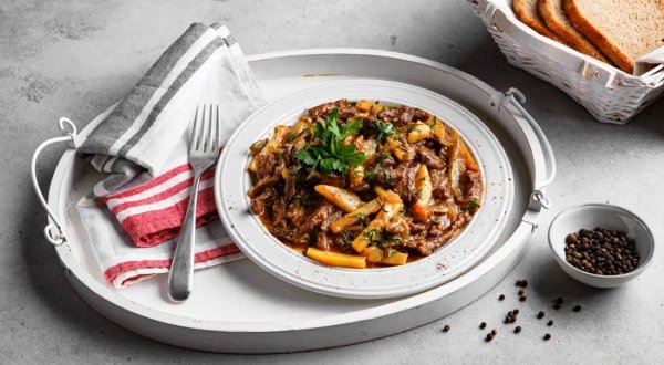 Описание: ✅ Азу из говядины с овощамиАзу из говядины с овощами давно стало для многих из нас любимым и привычным, что не удивительно: мясо с картофелем, солеными огурцами и томатным соусом – совершенно особенный и узнаваемый вкус. Для этого блюда мясо нарезают небольшими кусочками, предварительно обжаривают и затем тушат. А значит, вы можете готовить азу из бюджетных частей говядины, например, из покромки или диафрагмы – в процессе приготовления мясо обязательно станет мягким. Выбирайте крепкие соленые огурцы, желательно, бочкового посола – ведь они значительно влияют на вкус всего блюда! А картофель лучше взять нерассыпчатый, так называемых восковых сортов – тех, что хорошо сохраняют форму при варке. Для 4 порций нужно: ◆ 600–700 г говяжьей диафрагмы или покромки◆ 2 средние картофелины◆ 2 средние луковицы◆ 2 средних соленых огурца◆ 150 г томатного пюре◆ мука - для посыпки мяса◆ растительное масло - для жарки◆ 1 лавровый лист◆ соль - по вкусу◆ свежемолотый черный перец - по вкусуГотовка: 1 ч▶ Нарежьте мясо тонкими пластами поперек волокон. Затем каждый пласт нарежьте полосками. Присыпьте мясо мукой, смешанной с солью и перцем, обваляйте каждый кусочек и стряхните лишнее.▶ В большой сковороде сильно разогрейте растительное масло и быстро обжарьте мясо до румяной корочки. Залейте мясо горячей водой на 2 пальца и тушите под крышкой 20 мин.▶ Очистите лук и картофель. Картофель нарежьте брусочками, лук –четвертинками колец, соленые огурцы – соломкой. В отдельной сковороде нагрейте немного растительного масла, обжарьте на среднем огне лук до мягкости, 5 мин.▶ Добавьте огурцы и томатное пюре, доведите до кипения. Переложите луково-томатную массу с огурцами в сковороду с мясом, тщательно перемешайте. Готовьте на небольшом огне под крышкой 15 мин.▶ В чистой сковороде нагрейте еще немного масла и обжарьте картофель почти до готовности – пусть у него будет поджаристая корочка. Посолите.▶ Добавьте к мясу картофель и лавровый лист. Аккуратно перемешайте и тушите еще 5 мин. Очистите чеснок, натрите на терке, заправьте азу, перемешайте и сразу же подавайте.❗ Полезный совет: Готовьте азу в казане или в тяжелой сковородке с толстым дном. Для разнообразия попробуйте заменить растительное масло топленым сливочным – это придаст блюду аутентичности (традиционности, подлинности).❗ Кстати: Азу традиционно готовят из говядины, но в последние десятилетия многие кулинары начали использовать для этого блюда филе курицы или индейки. Время приготовления от этого заметно сокращается, а вкус азу по-прежнему остается превосходным.