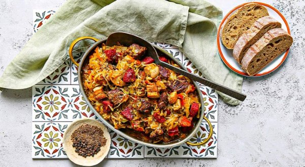 Описание: ✅ Бигос с говядинойБигос (или бигус) – традиционное блюдо польской кухни, ее гастрономический символ. Его название переводится как «мясное рагу» или «мясное блюдо», хотя вторым главным ингредиентом по праву в нем выступает белокочанная капуста, свежая и квашеная. Именно этот микс делает бигос таким необычным. Существует множество вариантов приготовления бигос даже на родине. Мы использовали почти классический рецепт - со свежей и квашеной капустой и говядиной с добавлением свиного сала и колбасы. Классический бигус подают горячим, часто с черным хлебом или картофельным пюре в качестве дополнительного гарнира, хотя блюдо вполне самодостаточное. Бигос идеально подойдет для холодного времени года и станет отличным вариантом для семейного ужина и даже для праздничного стола.