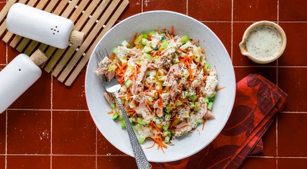 Описание: ✅ ПП-салат с тунцомУ нас был тунец, хрустящие овощи, легкая заправка с дижонской горчицей и всего 20 минут на приготовление. Что же получилось в итоге? Изысканный салат для поклонников правильного питания.Для приготовления 3 порций нужно:➡️ огурцы ➡ 2 шт.➡️ тунец в собственном соку ➡ 1 банка (170–185 г)➡️ морковь ➡ 1 шт.➡️ сельдерей ➡ 4–6 черешков➡️ соль ➡ по вкусу***Для заправки:➡️ йогурт обезжиренный ➡ 2 ст. л.➡️ горчица зернистая ➡ 1/2 ч. л.➡️ уксус белый винный ➡ 1/3 ч. л.➡️ свежемолотый черный перец ➡ по вкусуГотовка: 20 минут1. Соедините горчицу, уксус и йогурт, перемешайте до однородности, поперчите.2. Нарежьте огурцы, морковь и сельдерей мелкими кубиками, немного посолите.3. Разберите тунца на кусочки, смешайте с овощами и заправкой. Сразу же подавайте на стол.