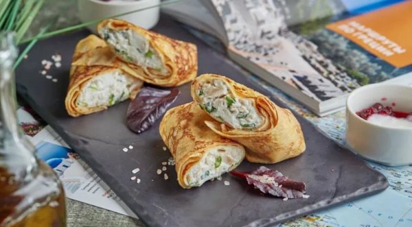 Описание: 🟠🟠🟠 Блины по-гречески - с фетой и зеленьюГреческие блины тиганитес по смыслу похожи на итальянскую пиццу: тесто в них служит футляром для самых разных начинок. Бывают тиганитес сладкие - щедро присыпанные корицей и буквально утопленные в меду, а также несладкие - с сыром или мясом, с зеленью и фаршем из потрохов. В оригинальном рецепте блин сначала печется, а потому еще и обжаривается на сковороде в большом количестве растопленного масла. В этом же рецепте блины не обжариваются, а готовятся в духовке.ИНГРЕДИЕНТЫ на 4 порции:🔶 3 яйца🔶 210 г муки🔶 500 мл молока🔶 1 ст.л. сахара🔶 20 мл подсолнечного масла🔶 5 г соли🔶 брусничный или любой другой соус – для подачи***Для начинки (на 10 блинов):🔶 500 г феты🔶 пучок зеленого лука🔶 600 г отварного куриного филе🔶 300 г натурального йогурта🔶 подсолнечное масло – по вкусуГОТОВКА: 30 мин🟧 - В молоко добавить яйца, хорошо перемешать. Всыпать сахар и соль, снова перемешать. Добавить муку и взбить тесто миксером. В готовое тесто добавить немного растительного масла.🟧 - Поджарить тонкие блины на смазанной маслом хорошо разогретой сковороде. По мере необходимости перед тем, как печь следующий блин, смазывать сковороду маслом.🟧 - Курицу нарезать тонкой соломкой, лук нашинковать и замешать с сыром фета.🟧 - Выложить начинку на блины и свернуть их конвертиком.🟧 - Убрать в духовку на 4 мин при температуре 180 градусов. Подавать с йогуртом и ягодным соусом.© Из Сети. Рецепт предоставил Андрей Макаев - шеф-повар ресторана Food Embassy.