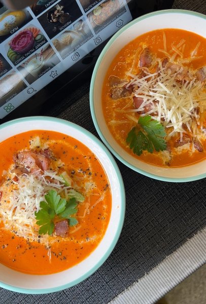 Овощной суп-пюре с кабачками, сливками, беконом и пармезаном.