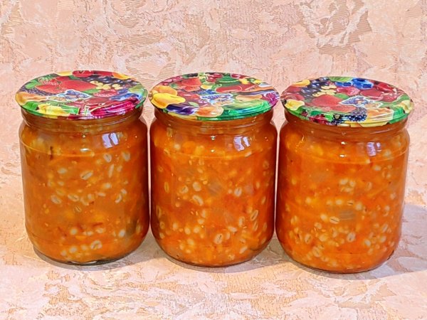 Описание: «ЗАВТРАК ТУРИСТА» С ПЕРЛОВОЙ КРУПОЙ.*Ингредиенты:Помидоры – 3 кг;Лук – 1 кг;Морковь – 1 кг;Болгарский перец – 1 кг;Перловая крупа – 0,5 кг;Сахар – 1 стакан;Соль – 3 ст. ложки;Масло растительное – 1 стакан;Уксус 70 % - 1 ст. ложка.*ПРИГОТОВЛЕНИЕ :Перловую крупу отварить до готовности, промыть. Перец порезать соломкой, помидоры пропустить через мясорубку.Лук нарезать кубиками, морковь натереть на крупной терке, добавить растительное масло, тушить лук с морковью 20 минут. Добавить к луку и моркови перекрученные помидоры, болгарский перец, соль, сахар. Довести до кипения, затем добавить перловую крупу. Варить 15-20 минут. Добавить уксус и проварить еще 5 минут. Разложить готовый салат в банки и закатать.*Приятного аппетита!