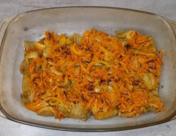 Описание: Минтай запеченный с картофелем в духовке. *Ингредиенты : Минтай 500гр. Лук 2шт. Морковь 2шт. Сыр 200гр. Картофель 1кг. Приправа для рыбы Майонез Соль, перец по вкусу *ПРИГОТОВЛЕНИЕ :Минтай хорошо промываем, чистим от черной пленки. Удаляем все плавники и хвост (сделать это просто обычными ножницами). Отделяем филе. Если не хочется долго возиться с рыбой, то купите готовое филе минтая. Режем на небольшие кусочки 5-7см. Засыпаем приправой для рыбы, хорошо перемешиваем и маринуем 30 минут. *Пока маринуется наша рыбка, делаем пассеровку. Лук режем полукольцами. Натираем морковь на крупной терке. С небольшим количеством масла пассеруем на маленьком огне, пока лук и морковь не станут мягкими. После чего снимаем с огня и даём остыть. *Чистим картофель и нарезаем кружками толщиной 1-2см. *Берём глубокий противень, смазываем растительным маслом и начинаем выкладывать слои. Первым слоем идёт минтай. Рыбу укладываем плотно вниз шкуркой. *На рыбу ровным слоем выкладываем нашу пассеровку и делаем сетку из майонеза (можно просто аккуратно распределить ложкой). *Выкладываем картофель, солим, перчим по вкусу. Ставим наше блюдо в духовку на 50 минут при 180 градусах. *За 15 минут до готовности посыпаем наше блюдо тёртым сыром.*Приятного аппетита!
