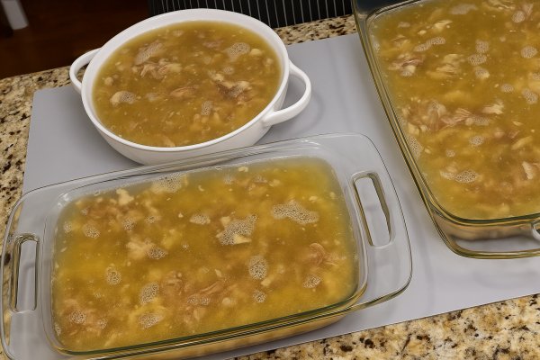 Описание: Холодец домашний.*Ингредиенты :- 700 г говядины- 1,5 кг свинины (лучше с косточкой)- 5–6 куриных ножек- 3 свиные ножки- 1 луковица, 2 черешка сельдерея, 1 морковь- соль по вкусу- лавровый лист, перец горошком (чёрный и душистый — по желанию)- 2–3 зубчика чеснока- 5–5,5 л воды (вода должна покрывать мясо на 2–3 пальца выше уровня)*ПРИГОТОВЛЕНИЕ :1. Обычно, чтобы холодец получился очень вкусным, я беру три вида мяса: свинину с косточкой, говядину и курицу. Для курицы я выбираю ножки — в них больше мяса и желирующих веществ, которые важны для застывания. Обязательно добавляю свиные ножки — они дают хороший крепкий бульон и натуральное желе.*2. Всё мясо перекладываю в кастрюлю, заливаю водой так, чтобы она полностью покрывала ингредиенты, и довожу до кипения. Через 1–2 минуты сливаю первый бульон, промываю мясо от пены, перекладываю в чистую большую кастрюлю, снова заливаю водой и довожу до кипения. После закипания аккуратно снимаю пену.*3. В бульон добавляю хорошо промытую неочищенную луковицу и несколько лавровых листьев. Лавровый лист убираю через полчаса. Затем довожу бульон до кипения, перевожу огонь на самый минимальный и варю около 5 часов при очень слабом кипении.*4. За час до окончания варки добавляю в бульон морковь, сельдерей и столовую ложку соли с горкой. Продолжаю варить до готовности. По окончании варки удаляю из бульона все овощи — морковь, лук и сельдерей. Морковь можно оставить для украшения.*5. Мясо выкладываю в чашу и оставляю остывать до тёплого состояния. Через чеснокодавку выдавливаю чеснок (2–3 зубчика) прямо в горячий бульон и даю ему настояться и остыть. Когда мясо остынет, отделяю его от костей с помощью ножа и вилки, куриную кожу удаляю. Всё мясо нарезаю мелкими кусочками.*6. Теперь разливаю холодец по формам. Я использую стеклянные контейнеры с герметичными крышками — это удобно для хранения. Вы можете взять порционные пиалы или любую удобную посуду. Сначала равномерно раскладываю мясо, затем процеживаю бульон через сито или марлю (для прозрачности) и пробую на соль — он должен быть немного пересолённым. Затем разливаю бульон по формам.*7. При желании холодец можно украсить сверху варёной морковью или зеленью. Я чаще всего оставляю его в классическом виде. Когда холодец остынет до комнатной температуры, убираю его в холодильник. Крышками пока не накрываю — это делаю спустя 2–3 часа, когда он полностью охладится. После этого контейнеры можно ставить друг на друга.*Когда холодец хорошо застынет, он будет готов к подаче. Подавайте его с горчицей, хреном или домашним соусом — это настоящая классика!*Советы и рекомендации :- Обязательно используйте три вида мяса — это и вкус, и желе, и правильная структура. Не ленитесь, результат будет шикарный.- Свиные ножки — наш природный желатин. Не хотите добавлять покупной — не экономьте на них.- Не пропускайте этап с первым сливом воды — он убирает лишний жир и делает бульон прозрачнее.