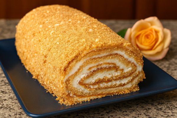 Описание: Медовый рулет.*Ингредиенты :Для теста :- Яйца — 4 шт. (+ щепотка соли)- Сахар — 120 г- Мёд — 100 г- Сливочное масло (растопленное) — 60 г- Мука — 200 г- Сода — 1 ч.л. (без горки)*Для крема :- Сливочное масло (размягчённое) — 250 г- Сахарная пудра — 150 г- Сливочный сыр — 180 г- Ванилин — по вкусу- По желанию — 1 ст.л. мёда*ПРИГОТОВЛЕНИЕ :1. Взбиваем яйца с щепоткой соли до лёгкой пены. Постепенно всыпаем сахар и продолжаем взбивать до его полного растворения и пышной массы.*2. Вводим жидкий мёд. Если он засахарился — подогрейте его до жидкого состояния (но не кипятите). Вливаем растопленное сливочное масло. Перемешиваем.*3. В отдельной миске просеиваем муку с содой. Постепенно вводим сухие ингредиенты в жидкие, перемешивая до однородного состояния. Тесто получится довольно жидким и будет приятно пахнуть мёдом.*4. Застилаем стандартный противень (примерно 30×40 см) пергаментной бумагой. По краям делаем бортики из бумаги. Выливаем тесто и равномерно распределяем. Выпекаем в заранее разогретой до 180 °C духовке около 12–15 минут до золотистого цвета. Не пересушите!*5. Готовый корж сразу выкладываем на полотенце или доску, снимаем бумагу. Пока тёплый, можно слегка свернуть в рулет, чтобы придать форму (по желанию). Обрезаем края — они понадобятся для крошки.*6. После остывания разрезаем корж вдоль на два слоя: аккуратно срезаем «верхушку», чтобы получилось два коржа одинаковой толщины.*7. Приготовим крем: взбиваем размягчённое сливочное масло до пышности. Добавляем сахарную пудру и ванилин, взбиваем до однородности. Затем добавляем сливочный сыр и (по желанию) мёд, снова взбиваем. Крем должен получиться гладким, густым и ароматным.*8. Готовим пропитку: смешиваем мёд с тёплой водой и несколькими каплями лимонного сока. При желании можно добавить немного коньяка или ликёра.*9. Нижний корж аккуратно снимаем с бумаги. Пропитываем его медовой смесью, затем равномерно наносим крем. Накрываем вторым коржом и также пропитываем.*10. Смазываем верхушку рулета кремом и аккуратно сворачиваем его. Заворачиваем в пищевую плёнку и убираем в холодильник минимум на 30 минут.*11. Перед подачей покрываем рулет оставшимся кремом и посыпаем крошкой из обрезков.*Делюсь опытом : - Если мёд засахарился, обязательно подогрейте его на водяной бане — он не должен быть кипящим, но должен стать жидким и ароматным.- Не ленитесь просеять муку и соду — это сделает тесто более лёгким, а корж — ровным и нежным.- Яйца лучше заранее достать из холодильника — комнатной температуры они взбиваются пышнее.- Не пересушите корж в духовке: как только он слегка подрумянится и упруго пружинит при нажатии — готов!- Чтобы рулет не треснул при сворачивании, можно ещё тёплый корж аккуратно скрутить с полотенцем и дать полежать — он «запомнит» форму.- Для крема важно, чтобы и масло, и сливочный сыр были одной температуры — так крем не расслоится.