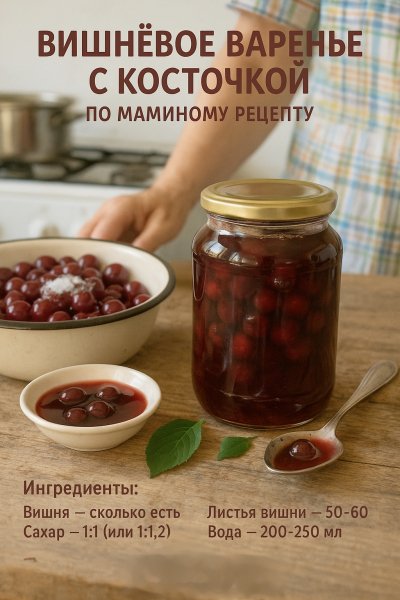 Описание: Вишнёвое варенье с косточкой.*Ингредиенты (на 1 порцию) :- Вишня — сколько есть, желательно спелая- Сахар — в пропорции 1:1 (или 1 кг вишни на 1,2 кг сахара, если вишня кислая)- Листья вишни — 50–60 штук, можно больше- Вода — 200–250 мл (для отвара из листьев)*ПРИГОТОВЛЕНИЕ :1. Ягоду перебрала, помыла, убрала плодоножки. Варенье из вишни мы любим с косточкой — косточка придаёт пикантный вкус варенью. После того, как промыла, даю вишне стечь. Потом пересыпаю в таз и засыпаю сахаром.*2. Сахаром засыпаю один к одному — если вишня сладкая. А если кислая — то на килограмм вишни беру 1 кг 200 г сахара. Оставляю на сутки, чтобы вишня пустила сок.*3. Когда пустит, ставлю её на огонь и, помешивая, довожу до кипения. Когда варенье закипит — кипячу его ещё 5 минут. После этого отставляю.*4. В это же время я нарвала листья вишни. Штук 50–60, можно и больше. Перемыла хорошо, налила в кастрюлю 200–250 граммов воды. Закрыла крышкой и поставила на газ. Всё это закипело, поварилось минут 5 — и я отставила, оставила остывать.*5. Вишня у меня тоже остывает — часа 4–5. После этого я опять её ставлю на огонь. Сливаю компот из вишнёвых листьев и добавляю его в варенье. Опять довожу до кипения и кипячу ещё 5 минут. Потом снова отставляю.*6. После этого оно у меня стоит ночь. Отстаивается. Утром ставлю на огонь последний раз. Варенье варится на медленном огне где-то в течение часа. И получается оно тёмно-бордового, красивого цвета. Я не довожу его до такой степени, чтобы оно стало коричневым, и вишня морщилась. Вишня получается красивая и очень вкусная. Сок тоже уваривается, но получается не очень густой — но и не жидкий. Прям очень крутой сироп.*7. Всё это я разливаю по кипячёным банкам. Не стерилизую больше. Закатываю и оставляю на зиму. Если варенье получилось жидковатое — это не страшно. Накладывайте в банки так, как вам нравится: в основном — ягоды. А сироп, который останется, закрутите отдельно.*И зимой вам скажут спасибо ваши родные — когда вы будете готовить оладьи или печь блины. Или очень вкусную пропитку для торта.*Советы :– Если сомневаетесь по сахару — ориентируйтесь на вкус вишни: кислая требует больше. Лучше слегка пересластить, чем пересушить вкус.– Листья вишни дают лёгкий травяной аромат и помогают сохранить цвет. Не бойтесь брать больше — хуже не будет.– Варенье с косточкой храните не дольше одного года, и обязательно следите, чтобы косточки не были повреждены.– Не переваривайте на последнем этапе: бордовый цвет красивее, чем бурый, и вкус нежнее.– Если варенье всё же жидкое — радуйтесь: сироп потом отлично пойдёт в домашний морс, в тесто, в чай и на пропитку тортов.*Приятного аппетита!
