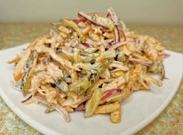Описание: Салат «Венгерский»Ингредиенты : ✅Куриное филе - 1 шт. ✅Красный лук - 0,5 шт. средней луковицы ✅Солёный огурец - 1 шт (не корнишоны) ✅Майонез ✅Сливочное масло - 15 г. ✅Соль, перец. ПРИГОТОВЛЕНИЕ :1. Куриное филе отбить нарезать на пластины вдоль, хорошо отбить. Посолить, поперчить, обжариваем на сковороде, на огне выше среднего до золотистой корочки и до полного приготовления. 2. Нарезаем обжаренное филе и маринованный огурец на полосочки, а лук на перышки поперек. 3. Все смешиваем и заправляем майонезом.Приятного аппетита!