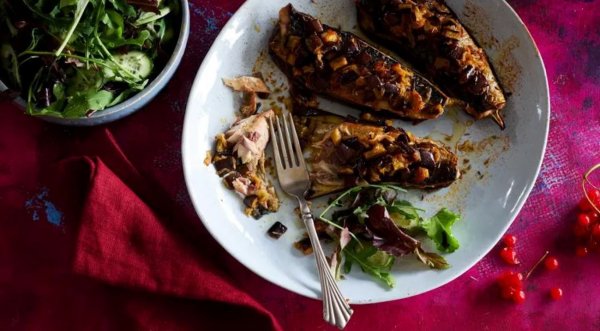 Описание: 🔷 Скумбрия, запеченная с баклажанамиБыстрый и легкий обед или ужин включает рыбу, богатую омега-3, запеченные баклажаны и ароматные специи. К такой скумбрии подайте зеленый микс-салат с огурцами, заправленный оливковым маслом и лимонным соком.✍️ Для приготовления 4 порций нужно:🔸 2 крупные скумбрии🔸 2 крупных баклажана🔸 3 средние луковицы🔸 4 зубчика чеснока🔸 оливковое масло🔸 по 1 ч. л. свежемолотой зиры и сладкой паприки🔸 соль, свежемолотый черный перец🔸 лимон – для подачи✍️ Готовка: 40 мин🔵 - Разогрейте духовку (лучше с грилем) до 180 °С. Застелите противень пергаментом. Разделайте скумбрию на филе с кожей, удалите все межреберные косточки, натрите рыбу перцем, солью и оливковым маслом со всех сторон.🔵 - Баклажан нарежьте вдоль так: из центральной части вырежьте 2 длинных пласта толщиной 2 см, края нарежьте пластами толщиной 1,5 см. Смажьте баклажаны оливковым маслом со всех сторон, приправьте солью, перцем и зирой. Разложите на противне, запекайте 20 мин.🔵 - Тем временем очистите и тонко нарежьте лук и чеснок, обжарьте в масле с солью до золотисто-коричневого цвета. По прошествии 20 мин. выньте тонкие пласты баклажанов, нарежьте небольшими кубиками, смешайте с луком и чесноком, приправьте паприкой.🔵 - На толстые пласты баклажанов выложите по 1 филе скумбрии кожей вверх, поставьте в верхнюю треть духовки, запекайте 6–7 мин. Выложите на рыбу смесь лука, чеснока и баклажанов, запекайте 2 мин., сразу подавайте.