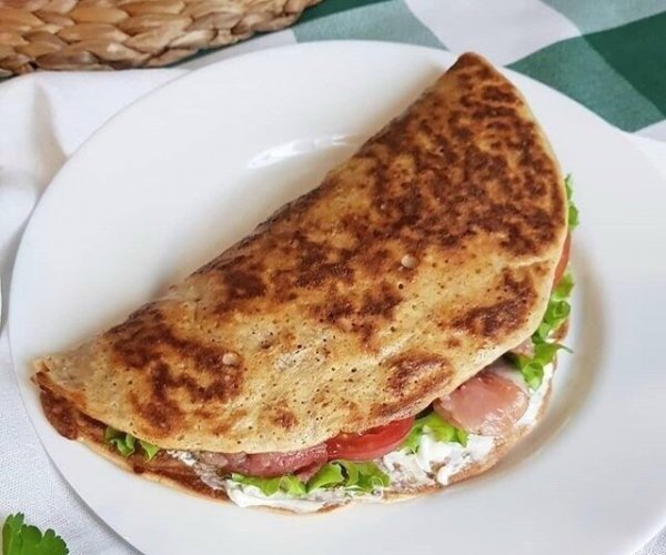 Описание: ОВСЯНОБЛИН на завтрак.*Ингредиенты :На один блин пропорции такие1 яйцо40 гр овсянки40 мл кефираСоль, сода, подсластитель*ПРИГОТОВЛЕНИЕ :Все перемешать и обжарить с двух сторон под крышкой на сковороде без масла (если антипригарное покрытие вызывает сомнение, смазать маслом)В первом случае перевернув блин я выложила кусочки сыра и закрыла крышкой. Пока пеклась другая сторона, сыр расплавилсяВторой вариант начинки- слабосоленая красная рыба, творожный сыр, листья салата и помидор.*Приятного аппетита!