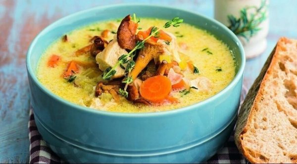 Описание: Суп грибной (с курицей). *Ингредиенты : - бульон куриный - 1,2 л. - филе куриное - 500 гр. - грибы - 500 гр. - лук репчатый - 1 шт. - чеснок - 2 зуб. - морковь - 2 шт. - сельдерей (стебель) - 2 шт. - сливки - 3/4 стак. - тимьян - 10 веточек - масло оливковое - по вкусу - соль - по вкусу - перец чёрный (молотый) - по вкусу * ПРИГОТОВЛЕНИЕ :1. Очистите овощи. *2. Лук и сельдерей нарежьте мелкими кубиками, чеснок порубите, морковь нарежьте кружками. *3. Почистите грибы и нарежьте средними ломтиками. *4. Куриное филе посолите и поперчите со всех сторон. *5. В большой кастрюле на среднем огне разогрейте оливковое масло. *6. Положите куриное филе и обжарьте до золотистого цвета, по 4 мин. с каждой стороны. *7. Переложите филе на разделочную доску и нарежьте небольшими кусочками. *8. Влейте в кастрюлю еще немного масла и положите лук, чеснок и грибы. *9. Немного посолите, поперчите и жарьте, помешивая, 5 мин. *10. Затем добавьте морковь и сельдерей и готовьте еще 5 мин. *11. Влейте куриный бульон и доведите суп до кипения. *12. Влейте сливки и варите при легком кипении 15 мин. *13. Добавьте в суп куриное филе и листочки тимьяна и снимите с огня. *Приятного аппетита!