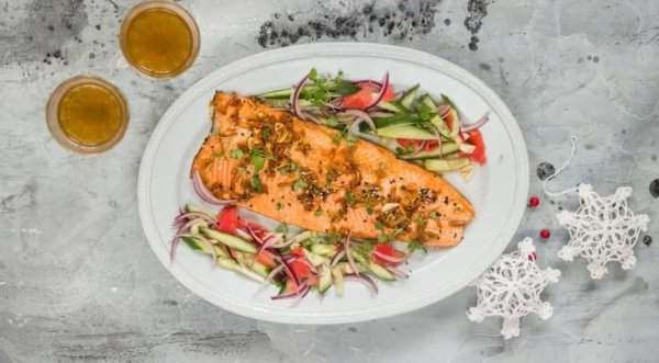 Описание: 🔶 Форель с чесноком и соевым соусомМаринад для запекания форели в духовке на основе соевого соуса с чесноком, медом и имбирем можно приготовить за считаные минуты — он придаст вкусу рыбы яркий азиатский колорит. Пока филе маринуется, приготовьте быстрый салат из острых огурцов. ✍️ Для приготовления 4 порций нужно:🔹 филе форели – 1 кг 🔹 соевый соус – 160 мл 🔹 жидкий мед – 150 мл 🔹 корень имбиря – 3 см 🔹 чеснок – 3 зубчика✍️ Для салата:🔹 длинноплодные огурцы – 2 шт.🔹 чеснок – 2 зубчика🔹 красная луковица – 1 шт.🔹 маринованный имбирь – 70 г 🔹 кресс-салат – для подачи🔹 соль – по вкусу✍️ Готовка: 1 час 20 минут🟠 – Приготовьте маринад для форели. Очистите чеснок и имбирь, натрите на мелкой терке. Смешайте соевый соус и мед, добавьте чеснок и имбирь. Теперь необходимо замариновать форель.🟠 – Нарежьте филе на порционные куски или оставьте целым. Положите филе в контейнер, залейте маринадом, накройте фольгой и уберите в холодильник на 1 час.🟠 – Очистите огурцы и разрежьте вдоль на 4 части. Ложкой выскребите семена и нарежьте огурцы на куски длиной 3–4 см. Очистите чеснок и очень мелко порубите. Измельчите маринованный имбирь. Лук нарежьте тонкими полукольцами. Смешайте в пакете огурцы и чеснок, посолите и хорошо потрясите. Добавьте лук и перемешайте. Оставьте на 15 минут в холодильнике.🟠 – Разогрейте духовку до 160 °C. Застелите противень бумагой для выпечки. Переложите форель на противень и поставьте в духовку. Целое филе запекайте 25 минут, порционные куски — чуть меньше.🟠 – В это же время слейте с огурцов выделившуюся жидкость и добавьте имбирь.🟠 – Переложите на блюдо рыбу, огуречный салат и подавайте.☝️ ПОЛЕЗНЫЙ СОВЕТ – Если для запекания в духовке вы используете замороженную форель, размораживайте ее в холодильнике, чтобы она оттаивала постепенно. Тогда рыба не потеряет много жидкости и останется сочной после приготовления.