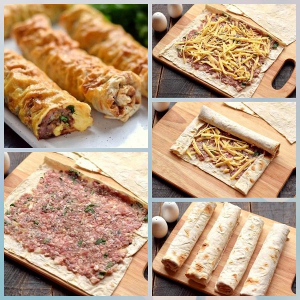 Описание: ТРУБОЧКИ ИЗ ЛАВАША С ФАРШЕМ.*Ингредиенты :Лаваш тонкий – 2 шт. Фарш свино-говяжий – 300-400 г. Сыр – 200 г. Яйцо – 1 шт.Лук – 1 шт. Чеснок – 1 зубик Петрушка – 20 г. Специи к мясу – по вкусу Соль, перец молотый – по вкусу*ПРИГОТОВЛЕНИЕ :Заранее приготовьте фарш, перекрутив мясо в мясорубке, отлично подойдет смесь говядины и свинины.*Лук очистите, нарежьте максимально мелко или перебейте в блендере. Зубочик чеснока пропустите через пресс. Зелень ополосните, нарежьте ножом. Все подготовленные компоненты добавьте в фарш, всыпьте соль, перец и любые специи к мясу.*Смесь тщательно перемешайте до однородности, лучше руками.*Тонкий лаваш разрежьте на два половинки. У вас должно получиться 4 одинаковые листа лаваша. Каждый лаваш с одной стороны смажьте мясной массой, охватывая весь периметр.*Сыр натрите на крупной терке, стружкой присыпьте мясной фарш.*Боковые края лаваша подвернитевнутрь, чтобы сыр не вытекал при запекании. Сверните лаваш с начинкой в плотный рулет.*Таким же образом сделайте с другими экземплярами.*Противень застелите пергаментной бумагой, выложите заготовки. Яйцо разбейте в пиалочку, расколотите в однородную смесь. Смажьте яйцом все трубочки.*Духовку прогрейте до 180 градусов, противень установите на среднюю полку. Трубочки на первые 15 минут запекания можно покрыть пергаментной бумагой, чтобы фарш полностью пропекся, а лаваш не пригорел сверху. Запекайте трубочки 35 минут при установленной температуре.Приятного аппетита !