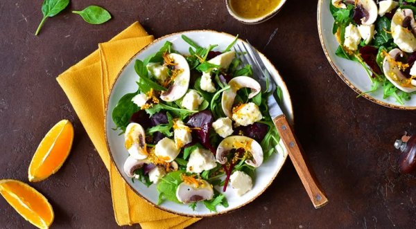 Название: Зеленый салат с шампиньонами, сыром и апельсиновой заправкой