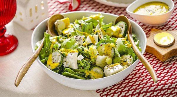 Описание: ✅ Зеленый салат с орехами и фетойЕсли вы едите салаты каждый день, то знаете, как непросто бывает придумать новый вариант любимого блюда. Наш рецепт поможет вам найти вдохновение. Зеленый салат с орехами и фетой на первый взгляд не так, чтобы очень оригинален. И ингредиенты довольно простые - свежий огурец, зеленый горошек, лук латук и фета. Все дело в заправке, которая способна сделать с простым салатом чудеса. Мы не ограничились одним оливковым маслом, но приготовили целый соус на его основе, добавив яблочный уксус и мед с пряностями и микс орехов с семечками. Получилось необычно, вкусно и питательно. Такой салат можно и на обеденный стол подать, и на праздничный.✏️ Для приготовления 4 порций нужно:🔺 салат латук – 1 большой кочан🔺 огурцы свежие – 2 шт.🔺 горошек зеленый свежемороженный – 0,5 стакана🔺 фета – 100 г✏️ Для заправки:🔺 тхина ((тахина, тахини) - кунжутная паста) – 2 ст. л.🔺 оливковое масло – 2 ст. л.🔺 яблочный уксус – 2 ст. л.🔺 мед – 1 ст. л.🔺 куркума молотая – 0,5 ч. л.🔺 соль, свежемолотый черный перец – по вкусу✏️ Для ореховой смеси:🔺 грецкие орехи – 1-2 горсти🔺 тыквенные семечки – 3 ст. л.🔺 семена подсолнечника – 3 ст. л.🔺 семена льна – 2 ст. л.✏️ Готовка: 20 мин🟩 Положите все ингредиенты для ореховой смеси в чашу блендера и измельчите в режиме «пульс» в грубую крошку.🟩 Для заправки смешайте оливковое масло с медом, уксусом, щепоткой соли и перца. Добавьте тхину и куркуму и хорошо размешайте. Подлейте 2–3 ст. л. воды, чтобы получилась заправка средней густоты.🟩 Положите горошек в кипящую подсоленную воду и отварите до готовности, 5 мин. Откиньте на дуршлаг и обдайте холодной водой.🟩 Нарвите листья латука средними кусочками. Огурцы нарежьте тонкими полукружиями. Смешайте латук с огурцами и горошком, полейте салат заправкой и посыпьте ореховой крошкой. Раскрошите фету при помощи вилки и посыпьте салат перед подачей.☝️ НА ЗАМЕТКУ – Приготовить салат с орехами и фетой можно заранее, а вот заправить лучше непосредственно перед подачей на стол, чтобы закуска сохранила свежий и бодрый вид.☝️ ПОЛЕЗНЫЙ СОВЕТ – Используйте для посыпки зеленого салата любые орехи, семечки и семена (чиа, кунжут) на свой вкус. При желании можно заменить зеленый горошек стручковой фасолью, а фету - на брынзу или адыгейский сыр.