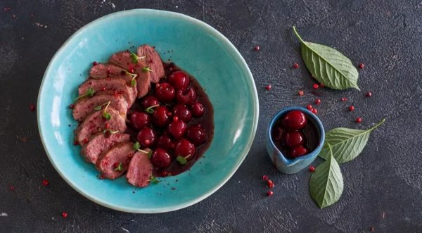 Описание: 🟠Утиное филе с черешневой приправой🟠Подавайте утиную грудку, нарезав ломтиками, с черешневой приправой, украсив свежими ягодами.✅ Для 2 порций нужно: ➦ 2 филе утиной грудки весом по 200 г➦ по 0,2 ч. л. молотой корицы и имбирного порошка➦ соль, черный перец – по вкусу❇️ Для приправы:➦ 150 г черешни➦ 100 мл портвейна➦ 100 мл куриного бульона➦ 50 мл соуса терияки➦ 1 веточка тимьяна➦ 1 ч. л. кукурузного крахмала➦ соль, розовый перец – по вкусу✅ Готовка: 30 мин✔️– Для приправы: у черешни удалите косточки, отложите 10 ягод для украшения. У тимьяна удалите стебли. Чеснок раздавите, очистите и порубите.✔️– Влейте портвейн и бульон в кастрюльку, доведите до кипения, добавьте черешню и выпарьте на сильном огне вполовину. Добавьте листочки тимьяна и чеснок, приправьте солью и перцем, готовьте 3–4 мин., снимите с огня. Добавьте терияки и размешанный в 1 ст. л. холодной воды крахмал, перемешайте. Верните на огонь и готовьте до загустения. Сохраняйте соус теплым.✔️– Кожу на утином филе надсеките крест-накрест через каждые 1,5 см, не трогая мякоть. Натрите смесью соли, перца, корицы и имбиря. Положите на разогретую на среднем огне сковороду на кожу, жарьте, поливая вытапливающимся жиром, 7 мин., и с другой стороны 1 мин.✔️– Доведите до желаемой степени прожарки в разогретой до 140 °С духовке, 5–10 мин. Выложите филе на тарелки, прикройте фольгой и дайте отдохнуть 3–5 мин. Подавайте, нарезав ломтиками, с черешневой приправой, украсив свежими ягодами.