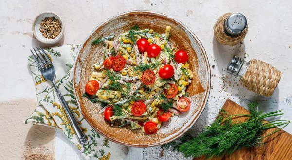 Описание: Салат с ветчиной, сыром и огурцом — свежий, легкий и при этом сытный — с одной стороны демократичен, с другой — вполне презентабелен, если его правильно подать. В этом салате очень важно единообразие нарезки. Основные ингредиенты — ветчину, сыр и огурцы — следует резать одинаковыми тонкими брусочками, или соломкой. Разнообразие внесет только кукуруза, а также помидоры черри, которые мы используем в качестве яркого украшения. Важные требования: огурцы нужны плотные, не водянистые. Сыр — любой полутвердый, от моцареллы для пиццы до чеддера. Он должен быть упругим: ведь мы не будем тереть его на терке, как вы уже поняли. Обратите внимание: в списке ингредиентов отсутствует соль. Если заправленный салат покажется вам недосоленным, добавьте ее. Но учитывая наличие соли в ветчине и сыре, дополнительная, скорее всего, не понадобится.✅ Для 6 порций нужно: ◆ Ветчина – 200 г◆ Сыр полутвердый – 150 г◆ Огурец – 200 г◆ Кукуруза сладкая консервированная – 150 г◆ Томат черри – 100 г◆ Лук красный – 50 г◆ Укроп – 15 г◆ Майонез – 2 ст.л.◆ Сметана 20% (средней жирности) – 1 ст.л.◆ Уксус белый винный – 2 ч.л.◆ Горчица дижонская – 1 ч.л.◆ Куркума – 0.5 ч.л.✅ Готовка: 20 мин➤ – Ветчину и полутвердый сыр нарежьте одинаковыми тонкими брусочками — длиной примерно 2,5–3 см, толщиной не более 5 мм. Переложите в миску оба ингредиента.➤ – Красный сладкий лук нарежьте тонкими перьями. Огурцы — такой же соломкой, как ветчину и сыр. Добавьте лук и огурцы в миску вместе с консервированной кукурузой из баночки.➤ – Свежий укроп промойте, насухо промокните салфетками. Удалите стебли, отложите несколько веточек для украшения, остальные порубите, но не слишком мелко. Добавьте в миску.➤ – Смешайте заправку в отдельной чашке: соедините майонез со сметаной, дижонской горчицей, белым винным уксусом и куркумой. Хорошо перемешайте. Заправка окрасится в солнечно-желтый цвет благодаря куркуме.➤ – Добавьте заправку в миску с нарезанными ингредиентами, хорошо перемешайте, приправьте свежемолотым перцем и выложите смесь в сервировочный салатник. Помидоры черри разрежьте пополам и украсьте ими и веточками укропа салат из ветчины, сыра и огурца сверху.☝️ НА ЗАМЕТКУ – Обратите внимание на то, что мы не стали замешивать помидоры черри в салат. Так он выглядит эстетичнее: помидоры присутствуют, дополняют вкус салата, но при этом не создают мешанину.☝️ КСТАТИ – Хитрость такого салата из ветчины, сыра, огурцов и помидоров, да еще и с кукурузой и луком в том, что любой из ингредиентов можно исключить, но салат все равно останется вкусным и гармоничным.