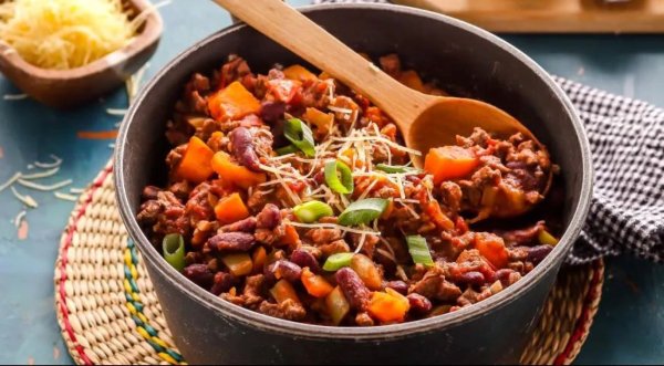 Описание: Вкус чили станет только лучше, если ему дать постоять после приготовления 2–3 часа. А лучше всего это рагу подать на следующий день, так что не бойтесь приготовить его заранее.✅ Для 4 порций нужно: ◆ 450 г говяжьего фарша◆ 300 г мякоти тыквы◆ 1 сладкий зеленый перец◆ 4 зубчика чеснока◆ 400 г консервированной красной фасоли◆ 700 г консервированных помидоров в собственном соку◆ 1/2–1 ч. л. молотого острого чили◆ 1 ч. л. молотой зиры◆ 1 ч. л. сахара◆ оливковое масло – по вкусу◆ соль, свежемолотый черный перец – по вкусу❇️ Для подачи:◆ тертый сыр чеддер – по вкусу◆ 5–6 стеблей зеленого лука◆ сметана – по вкусу✅ Готовка: 50 мин➤ – Очистите чеснок и мелко нарежьте. Сладкий перец освободите от семян и перегородок и нарежьте небольшими кубиками. Так же нарежьте тыкву.➤ – Фасоль выложите из банки на дуршлаг и промойте под холодной водой, дайте стечь.➤ – Разогрейте оливковое масло в большой сковороде. Добавьте фарш и жарьте, разбивая комочки лопаткой, 10 мин. При необходимости слейте лишний жир.➤ – Добавьте к фаршу тыкву, перец, чеснок и фасоль. Помидоры разомните вилкой и добавьте в сковороду вместе с соком. Влейте 2 стакана воды, всыпьте специи, сахар и соль, хорошо перемешайте и доведите до кипения.➤ – Тушите на медленном огне в течение 20–25 мин., пока тыква не станет мягкой. Снимите сковороду с огня и добавьте, если нужно, еще немного острого чили и черного перца.➤ – Разложите чили по тарелкам, посыпьте зеленым луком и тертым сыром и добавьте сметану.