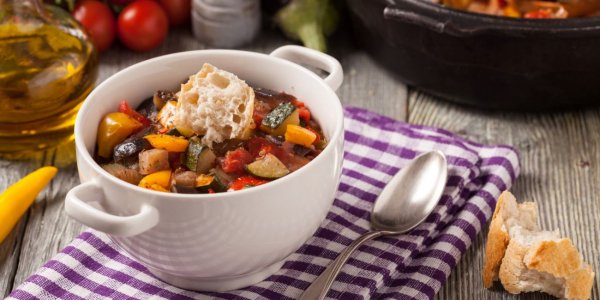 Описание: Традиционно овощи для этого блюда нарезаются кусочками. Сначала они обжариваются по отдельности, что позволяет сохранить их вкус.👉 Для 8 порций нужно: ⏩ Кабачки обычные или жёлтые – 450 г⏩ Цукини – 450 г⏩ Баклажаны – 450 г⏩ Сладкий перец – 900 г⏩ Репчатый лук – 450 г⏩ Чеснок – 3 зубчика⏩ Оливковое масло – 120 мл⏩ Тимьян – 2 веточки⏩ Розмарин – 1 веточка⏩ Лавровый лист – 1 штука⏩ Овощной бульон – 200 мл⏩ Соль – по вкусу⏩ Помидоры – 450 г👉 Готовка: 2 ч.🟤 – Кабачки и баклажаны нарежьте кубиками, перец — небольшими квадратиками, лук — кусочками. Чеснок измельчите ножом.🟤 – В глубокой сковороде или кастрюле разогрейте 2 ложки масла на среднем огне. Обжарьте лук до мягкости примерно за 5 минут. Закиньте чеснок и убавьте огонь до минимального. 🟤 – В другой сковороде разогрейте 2 ложки масла на сильном огне. Партиями обжарьте кабачки до лёгкой румяности со всех сторон и выложите к луку.🟤 – Добавляя немного масла, таким же образом обжарьте перцы и баклажаны, по мере готовности выкладывая к луку.🟤 – Сделайте сильный огонь и перемешайте овощи. Добавьте веточки тимьяна с розмарином, лавровый лист, горячий бульон и соль. Доведите до кипения.🟤 – Убавьте огонь до минимального и тушите овощи без крышки примерно полчаса, время от времени помешивая, или переставьте в разогретую до 200 °С духовку на полчаса.🟤 – Опустите помидоры в кипяток на минуту, ополосните под холодной водой, очистите от кожицы и семян. Мякоть нарежьте небольшими кусочками. 🟤 – Установите дуршлаг над миской и выложите в него приготовленные овощи, чтобы собрать выделившиеся при приготовлении соки. Выбросьте лаврушку, тимьян и розмарин.🟤 – Собранную жидкость перелейте в сотейник и уваривайте на умеренном огне до лёгкого загустения. Добавляйте жидкость по мере того, как она вновь будет скапливаться в миске под овощами.🟤 – Верните овощи в сковороду или сотейник, добавьте помидоры и залейте вываренным соком. Оставьте под крышкой на 10 минут.