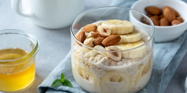 Описание: Классический вариант овсянки на молоке с добавлением мёда и сытных топингов. Для этого рецепта лучше взять овсянку, которая обычно варится 15 минут.🟨 Для 2 порций нужно: ⏩ Овсяные хлопья – 200 г⏩ Мёд – 2 ст. ложки⏩ Соль – 2 щепотки⏩ Молоко – 200 мл⏩ Банан – 1 штука⏩ Фундук – 40 г⏩ Миндаль – 40 г🟨 Готовка: 8 ч.🟤 – Возьмите две банки объёмом не менее 250 мл и всыпьте туда овсянку, добавьте мёд и соль. Перемешайте.🟤 – Залейте молоком, закройте крышкой и уберите в холодильник на ночь.🟤 – Утром добавьте нарезанный банан и орехи.