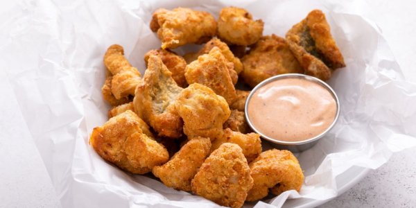 Описание: 👉👉👉 Рыбные наггетсы - из филе сомаНежное и бескостное рыбное филе выходит особенно вкусным в румяной и хрустящей оболочке. 👉 Для 4 порций нужно: 🔸 Мука пшеничная – 120 г🔸 Мука кукурузная – 150 г🔸 Соль – по вкусу🔸 Чёрный молотый перец – по вкусу🔸 Яйца – 2 штуки🔸 Филе сома – 700 г🔸 Растительное масло – 500 мл👉 Готовка: 35 мин.🟫 – Смешайте половину пшеничной муки, кукурузную муку, чайную ложку соли и перец. Оставшуюся муку насыпьте в отдельную миску и добавьте немного соли с перцем.🟫 – Венчиком или вилкой взбейте яйца. 🟫 – Филе сома нарежьте небольшими кусочками, посолите и поперчите.🟫 – В кастрюле или сковороде разогрейте масло на среднем огне. 🟫 – Несколько кусочков рыбы по одному обваляйте в пшеничной муке, опустите в яйца и покройте смесью обычной и кукурузной муки. Обжарьте примерно за 3 минуты и выложите на бумажные полотенца. 🟫 – Таким же образом партиями приготовьте все наггетсы.