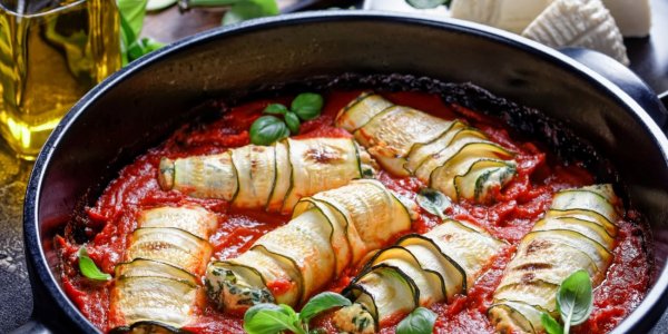 Описание: 🥣🥣🥣 Рулетики из кабачков, фаршированные шпинатом и сыромСочное блюдо, которое можно подать к мясу или любимому гарниру. Для приготовления начинки понадобится блендер.✅ ИНГРЕДИЕНТЫ: 📌 Оливковое масло – 1 ст. ложка📌 Шпинат – 2 пучка📌 Чеснок – 2 зубчика📌 Рикотта – 100 г📌 Соль – по вкусу📌 Перец чёрный молотый – по вкусу📌 Кабачки молодые – 3 штуки📌 Протёртые томаты – 100 г📌 Базилик свежий – несколько веточек✅ ГОТОВКА: 40 мин.🟤 – Прогрейте сковороду с оливковым маслом, выложите шпинат и чеснок. Готовьте 2 минуты на среднем огне.🟤 – Соедините в чаше блендера содержимое сковороды, рикотту, соль и перец. Измельчите.🟤 – Кабачки нарежьте тонкими слайсами. Удобнее всего это делать овощечисткой.🟤 – На край кабачкового слайса выложите 1–2 чайные ложки начинки, скрутите в рулетик. Поступите так со всеми кабачками.🟤 – Возьмите форму для запекания, вылейте в неё протёртые томаты, посолите. Сверху выложите фаршированные кабачки.🟤 – Запекайте в заранее разогретой до 200 ℃ духовке 20 минут.🟤 – Подавайте, украсив свежим базиликом.