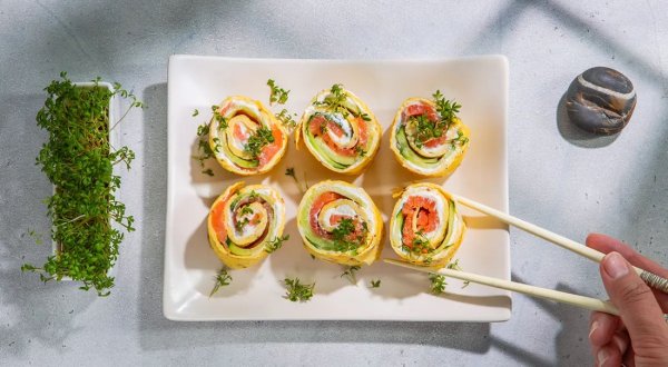 Название: Яичные роллы с творожным сыром, красной рыбой и огурцом