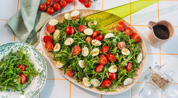 Описание: 🔴 Салат из руколы с медово-горчичным соусомЛегкое, пикантное блюдо со вкусной заправкой, в которой удивительным образом сочетаются сладость меда и едва уловимая острота дижонской (французской) горчицы. Кроме того, в состав соуса для салата с руколой входит растительное масло — в нашем рецепте выбор сделан в пользу оливкового. Изысканный оттенок соусу придает бальзамический уксус с его кисло-сладким вкусом и виноградным послевкусием. Но если на вашей кухонной полке его не найдется, то не расстраивайтесь. Для соуса к салату из руколы в дуэт горчицы и меда можно добавить чайную ложку готового соуса терияки или соевого соуса, в крайнем случае — сок лимона.✅ ИНГРЕДИЕНТЫ:📌 Руккола – 100 г📌 Яйцо перепелиное – 10 шт.📌 Томат черри – 200 г📌 Соль – по вкусу📌 Перец чёрный молотый – по вкусу🔹🔹🔹 Для соуса:📌 Масло оливковое – 1 ст.л.📌 Мед – 1 ст.л.📌 Горчица дижонская – 1 ст.л.📌 Уксус бальзамический – 1 ч.л.✅ ГОТОВКА: 20 мин.🥣 – Перепелиные яйца сполосните, сварите вкрутую (после закипания воды 3 минуты), слейте горячую воду и поставьте их остывать в холодной воде, затем очистите и разрежьте на половинки. 🥣 – Помидоры и зелень руколы хорошо промойте, обсушите. Черри нарежьте дольками или половинками. Руколу нарвите руками на блюдо или в отдельные небольшие салатники.🥣 – Разложите поверх листочков зелени нарезанные дольки помидорок черри и половинки перепелиных яиц. Посолите по вкусу и приправьте свежемолотым черным перцем.🥣 – В глубокой чашке смешайте мед, зернистую горчицу, оливковое масло и бальзамический уксус. Венчиком или вилкой хорошо взболтайте заправку, чтобы она стала однородной.🥣 – Полейте салат с руколой медово-горчичным соусом, аккуратно перемешайте. Если вы готовили салат в глубокой миске, чтобы потом разложить его порционно, то перемешайте его руками, так салатная зелень меньше помнется. 👉 НА ЗАМЕТКУ – Рукола в салате с медово-горчичной заправкой будет отлично сочетаться и другой нежной зеленью, например, с листовым салатом или кресс-салатом. Дополнить список ингредиентов в этом рецепте можно и за счет красного лука, нарезанного тонкими полукольцами. 👉 КСТАТИ – Салат из руколы с медово-горчичным соусом приобретет более выраженный ореховый вкус, которым и так обладает рукола, если добавить в список ингредиентов кедровые орешки. Предварительно их можно обжарить на сухой сковороде.