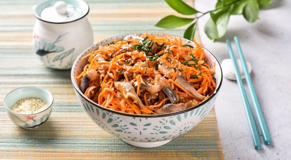 Описание: 🟦 Хе из сельди по-корейски с морковью и лукомЭто блюдо совсем нетрудно приготовить в домашних условиях. Продукты для этого нужны самые обычные, специи — как для корейской моркови, а рецепты различаются между собой разве что в мелких деталях — например, можно жарить лук, а можно класть сырым, заливая все горячим маслом. По сути все просто. Единственная морока — разделать селедку. Ведь никто не любит потрошить и чистить рыбу. На самом деле процесс может даже доставить удовольствие, особенно если думать, какая вкуснятина ждет вас впереди.✅ ИНГРЕДИЕНТЫ:📌 Сельдь свежемороженая – 500 г📌 Морковь – 200 г📌 Лук репчатый – 100 г📌 Чеснок – 3 зубчика📌 Масло подсолнечное – 3 ст.л.📌 Соус соевый – 1 ст.л.📌 Уксусная эссенция 70% – 2 ч.л.📌 Сахар-песок – 1 ч.л.📌 Кориандр молотый – 1 ч.л.📌 Перец чили – 1/2 ч.л.📌 Масло кунжутное – 1/2 ч.л.📌 Перец чёрный молотый – по вкусу📌 Соль – по вкусу🔹🔹🔹 Для подачи:📌 Кунжут – 1 ч.л.📌 Зелень – по вкусу✅ ГОТОВКА: 45 мин. (+ 2 ч. доп. времени)🥣 – Сельдь разморозьте в холодильнике. Отрежьте голову, разрежьте брюшко и выскоблите ножом все внутренности вместе с темными пленками. Если в рыбе есть икра или молоки, не выкидывайте, их тоже можно использовать.🥣 – Хорошо промойте рыбину, отрежьте хвост и все плавники. Сделайте тонкий надрез вдоль спинки по всей длине тушки и стяните кожу, подцепив ее ножом с того конца, где была голова, сначала с одной стороны, затем с другой.🥣 – Аккуратно отделите филе от хребта с обеих сторон. Затем проверьте филе на отсутствие мелких костей, удалите их пинцетом. Нарежьте филе тонкими поперечными ломтиками.🥣 – Сложите кусочки сельди в миску (вместе с икрой или молоками), посыпьте половиной чайной ложки соли и полейте уксусной эссенцией. Быстро перемешайте. Удобно сделать это рукой в перчатке, чтобы кислота покрыла все кусочки. Накройте пленкой и оставьте мариноваться хотя бы на полчаса.🥣 – Тем временем займитесь овощами. Морковь тщательно вымойте и очистите. Натрите на терке для корейской моркови или нарежьте тонкой соломкой острым ножом вручную.🥣 – Выложите морковь в отдельную миску, слегка посолите и помните рукой. Дайте моркови постоять, пока маринуется селедка. Морковь должна обмякнуть и пустить сок.🥣 – Пока сельдь и морковь настаиваются, очистите репчатый лук и чеснок. Лук нарежьте тонкими полукольцами. Зубчики чеснока раздавите плоской стороной ножа и мелко порубите.🥣 – Слейте выделившуюся жидкость с рыбы, слегка отжимая ее. Затем также слейте сок с моркови. Выложите морковь в миску с селедкой. Полейте соевым соусом и кунжутным маслом, посыпьте хлопьями перца чили, молотым черным перцем, кориандром и сахаром. Добавьте сверху пропущенный через пресс чеснок.