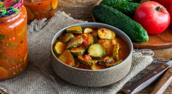 Описание: 🟣 Огурцы, маринованные в томатном соусе - на зимуИзысканная и очень вкусная заготовка. Огурцы добавляют в томатный маринад, пока он еще кипит на плите. И потом все вместе раскладывают по банкам. Поэтому закуска не требует дополнительной стерилизации, что значительно облегчает процесс консервирования. Открыв баночку таких огурчиков зимой, на следующее лето вы точно сделаете несколько порций.✅ ИНГРЕДИЕНТЫ:📌 5 кг огурцов📌 2 кг помидоров📌 200 г чеснока📌 1 стакан растительного масла📌 1 стакан сахара📌 3 ст. л. соли📌 3 ч. л. уксусной эссенции📌 по 5 горошин черного и душистого перца✅ ГОТОВКА: 35 мин. (+ 20 мин. доп. времени)🥣 – Подготовьте стерилизованные банки объемом 700-1000 мл. Очистите чеснок. Хорошо вымойте помидоры. Нарежьте помидоры и проверните вместе с чесноком через мясорубку или измельчите в блендере в пюре.🥣 – Смешайте в большой кастрюле растительное масло, сахар, соль и перец. Добавьте протертые помидоры с чесноком, доведите до кипения и варите на среднем огне 15 мин.🥣 – Огурцы хорошо вымойте в холодной воде и нарежьте кружками толщиной 5 мм. Положите огурцы в томатный соус и добавьте уксусную эссенцию. Кипятите 5 мин.🥣 – Разложите горячие огурцы вместе с томатным соусом по стерилизованным банкам и сразу закатайте крышками. Переверните банки вверх дном, укутайте и оставьте до полного остывания.👉 НА ЗАМЕТКУ – Если вы хотите, чтобы ваши огурцы были остренькие и пряные, рекомендуем добавить в банку один стручок острого перца и пару листиков черной смородины. 👉 КСТАТИ – Огурцы вполне могут храниться и при комнатной температуре. Единственное, найдите для них такое место, куда не будет проникать прямой солнечный свет.