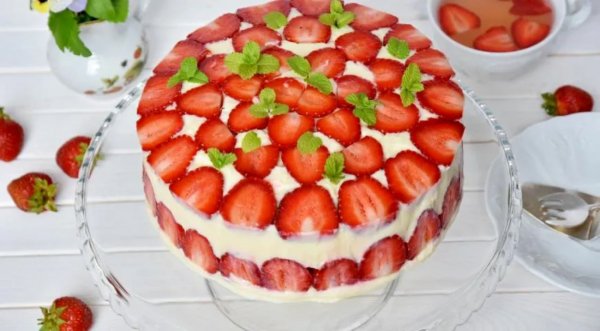 Описание: 🟠 Клубничный торт «Фрезье»Красивый французский десерт - торт «Фрезье» с нежнейшим бисквитом «Женуаз», легким кремом «Муслин» и клубникой никого не оставит равнодушным.✅ ИНГРЕДИЕНТЫ:🧺 мука – 120 г🧺 сахар – 260 г🧺 яйца – 4 шт.🧺 сливочное масло – 270 г🧺 ванильный экстракт – 1 ч.л.🧺 соль – 1 щепотка🧺 желтки яичные – 7 шт.🧺 молоко – 700 мл🧺 крахмал – 70 г🧺 клубника – 600 г🧺 мята – 1 пучок✅ ГОТОВКА: 30 мин. (+ 30 мин. доп. времени)🥣 В миске смешать 4 яйца, 120 грамм сахара, чуть соли и и немного ванильного экстракта. Поставить миску на водяную баню и не переставая взбивать массу до однородного состояния. Масса в процессе взбивания увеличится в объеме. Продолжить взбивать миксером до пышной массы. Добавить просеянную муку и аккуратными движениями снизу вверх смешиваем муку со смесью. Растопить 60 грамм масла сливочного в микроволновке и осторожно ввести в тесто. Форму для выпечки выложить пергаментом, смазанным маслом. Выложить аккуратно тесто, разровнять. Выпекать при 180 градусов 25-30 минут. Дать коржу немного отдохнуть в форме затем извлечь на решетку. Разрезать бисквит на 2 части🥣 Молоко довести до кипения. 7 желтков растереть с 140 граммами сахара, добавить крахмал. Горячее молоко тонкой струйкой влить в желтковую массу, не переставая перемешивать ее венчиком. Возвращаем всю массу на медленный огонь и варим непрерывно и интенсивно взбивая смесь венчиком минуты2-3. снять с огня, добавить 40 грамм сливочного масла. Перемешать. Накрыть крем пленкой "в контакт" и оставить охлаждаться. Охлажденный крем взбить с 170 граммами сливочного масса до однородности.🥣 Ягоды клубники помыть, обсушить салфеткой, удалить плодоножку и разрезать пополам. Разъемную форму для торта выстелить пищевой пленкой. Выложить дно формы половинками ягод клубники, промежутки между ягодами заполнить кремом. Выложить часть крема распределив по всей поверхности формы. Сверху на крем выложить бисквит. Оба бисквита должны быть меньшими по диаметру чем форма. Бисквит вдавливаем в крем.🥣 Половинками клубники оформляем бока торта, прислоняя каждую ягоду плотно к стенке, носиком вниз, вдавливаем в крем. Ягоды фиксировать с помощью крема. Снова выложить часть крема на поверхность , разровнять. Распределить несколько ягод клубники по крему в хаотичном порядке. Покрыть кремом. Сверху уложить бисквит. Промежутки заполнить оставшимся кремом. Торт поставить на ночь в холодильник. Останется только перевернуть его на блюдо и удалить форму. Украсить торт листиками мяты.🔥НА ЗАМЕТКУ. Бисквит можно пропитать сиропом, сваренным из сока 2 апельсинов, 50 мл. воды и 100 гр. сахара🔥СОВЕТ. Для того чтобы клубника оставалась блестящей и яркой поверхность торта смажьте желейной глазурью.