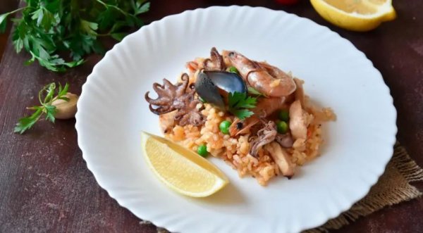 Описание: 🟤 Паэлья с курицей и морепродуктамиПаэлья с курицей и морепродуктами соединила в себе все вкусы и ароматы Испании: лучшее оливковое масло, томаты, паприка, чеснок и морепродукты — это блюдо по праву считается гордостью страны. Традиционно паэлью подают прямо в сковороде (она так и называется — паэльера), а если паэлья готовится с морепродуктами, то креветки, ракушки и другие дары моря обязательно должны быть нечищеными, так что не удивляетесь. Готовьте испанскую паэлью с морепродуктами и курицей по проверенному рецепту — и у вас всё получится!✅ Ингредиенты:📍 рис круглозёрный – 1,5 стакана📍 вода – 2 стакана📍 лук репчатый – 1 шт.📍 болгарский перец – 1 шт.📍 соль – 1 ч.л.📍 томаты – 200 г📍 чеснок – 2 шт.📍 филе куриной грудки – 200 г📍 морепродукты – 800 г📍 зелень – 1 пучок📍 оливковое масло – 100 мл📍 молотый чёрный перец – 1 щепотка📍 зелёный горошек свежий – 100 г✅ Готовка: 45 мин. (+ 15 мин. доп. времени)🥣 В сотейнике разогрейте часть оливкового масла и обжарьте морепродукты в течение 3-4 минут на среднем огне. Выложите их из сотейника на подготовленное блюдо.🥣 При необходимости влейте в сотейник ещё порцию оливкового масла и пассеруйте нарезанные мелким кубиком репчатый лук, болгарский перец, чеснок.🥣 К овощам добавьте нарезанное филе куриной грудки. Посолите, поперчите по вкусу.🥣 Добавьте кубики свежих или консервированных помидоров и потомите минут 7-10 до выпаривания лишней влаги.🥣 Рис промойте до прозрачной воды. Откиньте на сито и дайте стечь жидкости. Выложите рис в сковороду и обжаривайте минут 7, помешивая лопаткой. Влейте воду или бульон. На сильном огне доведите до кипения и выпаривания воды до уровня риса. Затем поверх риса разложите заранее обжаренные морепродукты и зелёный горошек. Накройте сковороду крышкой и на медленном огне доведите рис до готовности в течение 20-25 минут.🔥 НА ЗАМЕТКУ. В этот рецепт паэльи с морепродуктами и курицей вы легко можете вносить изменения. Например, исключить из списка ингредиентов филе куриной грудки, а из морепродуктов оставить только креветки или вообще приготовить паэлью с кальмарами.🔥 КСТАТИ. Для приготовления паэльи с морепродуктами и курицей лучше всего подойдут итальянские сорта риса, например, Арборио или Карнароли. Испанские Бомба или Альбуфера — вообще идеальный вариант, но у нас в стране встречаются они на прилавках магазинов крайне редко.