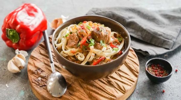 Описание: 🟥 Лагман из свининыЛагман — сытное и питательное среднеазиатское блюдо, которое традиционно готовят с бараниной. Мы же предлагаем заменить её свининой, потому что купить её проще, да и готовится она быстрее. Вообще же лагман состоит из трёх главных ингредиентов — лапши, мяса и бульона. Что касается первого, то, разумеется, классический рецепт требует использования домашнего варианта. Но нам кажется, что если вы найдёте хорошую лапшу для лагмана или просто возьмёте качественную широкую, блюдо получится не менее вкусным. Успех лагмана из свинины во многом зависит и от правильно подобранных специй, а также овощей. А ещё одна замечательная особенность блюда заключается в том, что его можно подавать как на первое, так и на второе: всё зависит лишь от пропорций бульона и остальных ингредиентов.✅ Ингредиенты:📍 мякоть свинины – 500 г📍 растительное масло – 50 мл📍 сладкий перец – 2 шт.📍 редька – 1 шт.📍 репчатый лук – 2 шт.📍 консервированные томаты в собственном соку – 150 г📍 бульон – 500 мл📍 лапша для лагмана – 400 г📍 чеснок – 1 зубчик📍 пряная зелень – 70 г📍 молотая паприка – 1 ч.л.📍 молотый красный перец – на кончике ножа📍 соль – по вкусу✅ Готовка: 1 ч. 10 мин. (+ 20 мин. доп. времени)🥣 Подготовьте мясо для лагмана. Для этого мякоть свинины вымойте и хорошо обсушите бумажным полотенцем. Мясо нарежьте небольшими кубиками или тонкими полосками.🥣 В казане или глубокой сковороде с толстыми стенками раскалите масло. Положите подготовленную свинину и жарьте до румяной корочки. Посолите, добавьте паприку и молотый красный перец.🥣 Подготовьте овощи. Сладкий перец вымойте и разрежьте на половинки. Удалите семена и перегородки. Мякоть нарежьте соломкой. Редьку очистите и нарежьте так же. Лук очистите и нарежьте полукольцами.🥣 Все подготовленные овощи добавьте в казан или сковороду к жареной свинине. Перемешайте лопаточкой. Жарьте всё вместе на сильном огне в течение 3–5 минут.🥣 К мясу с овощами добавьте консервированные томаты (их можно измельчить блендером или размять вилкой), бульон и доведите до кипения. Тушите под крышкой на слабом огне 40 минут.🥣 Приготовьте лапшу. Для этого доведите в большой кастрюле ёмкостью не менее 3 л воду до кипения и немного посолите её. Опустите лапшу и варите 10 минут. Откиньте на дуршлаг.🥣 Чеснок очистите и пропустите через пресс. Пряную зелень вымойте, обсушите и порубите. Немного отложите для подачи. Оставшуюся зелень вместе с чесноком добавьте в лагман со свининой. Тушите 5 минут.🥣 По порционным тарелкам распределите сначала сваренную лапшу, затем мясо с овощами в бульоне. Приготовленный лагман со свининой можно посыпать рубленой зеленью.