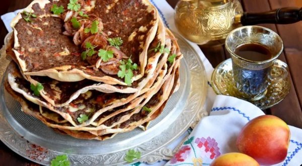 Описание: 🟫 Лахмаджун по-турецкиЛахмаджун — популярный турецкий фастфуд, который нередко именуют не иначе как «турецкая пицца». Подобные изделия из теста встречаются и в других национальных кухнях — например, армянские ламаджо. И ламаджо и лахмаджун представляют собой тонкие лепёшки с сочной мясной начинкой и пряностями. Тесто для лахмаджуна раскатывают настолько тонко, что без должной сноровки не каждая хозяйка управится с лепёшкой, не порвав её. Перед едой в лепёшку кладут салат из красного лука с зеленью, приправленный солью и сумахом, поливают лимонным соком и сворачивают в трубочку. Приятного аппетита!📌 Нужно:🔹 мука – 3 стакана🔹 тёплая вода – 1 стакан🔹 дрожжи – 11 г🔹 соль – 1,5 ч.л.🔹 сахар – 1 ч.л.🔹 растительное масло – 1 ст.л.🔹 мясо говядины или баранины – 600 г🔹 болгарский перец – 1 шт.🔹 репчатый лук – 1 шт.🔹 острый перец – 0,5 шт.🔹 кумин – 1 ч.л.🔹 молотый чеснок – 1 ч.л.🔹 сумах – 1 ч.л.🔹 томатная паста – 2 ч.л.🔹 красный лук – 1 шт.🔹 петрушка – 1 пучок📌 Готовка: 1 ч. 30 мин. (+ 1 ч. 30 мин. доп. времени)🟩 Для теста муку просеять, смешать с солью (0,5 ч.л.), сахаром и дрожжами. Влить тёплую воду и растительное масло. Замесить тесто. Месить не менее 5 минут. Тесто по консистенции мягкое и эластитчное. Миску смазать растительным маслом выложить тесто, накрыть плёнкой и оставить в тёплом месте на 1 час для подьёма.🟩 Для начинки перекрутить на мясорубке мясо. Для фарша используется говядина или баранина, можно взять смешанный фарш. Измельчить красный острый перец, зелень, болгарский перец, репчатый лук. Добавить к фаршу. Посолить (1 ч.л.), всыпать кумин, молотый чеснок и томатную пасту. Перемешать.🟩 Тесто разделить на 10 частей, скатать шарики. Накрыть кухонным полотенцем и оставить на 30 минут. Каждый шарик раскатать на рабочей поверхности, присыпанной мукой, в лепёшку толщиной 3 мм. Распределить ровным, тонким слоем фарш.🟩 Выпекать лепёшки в духовке, разогретой до 250 градусов по 8-9 минут. 🔥 НА ЗАМЕТКУ. Вместо томатной пасты можно взять свежие томаты, очищенные от кожицы и мелко нарезанные. Пряный вкус лепёшек прекрасно оттенит любой кисломолочный напиток. Например, тан.🔥 КСТАТИ. Тесто для лахмаджуна удобнее всего сразу раскатывать на бумаге для выпечки. Так лепёшку будет легче перенести на противень. А готовые лепёшки складывайте стопочкой и подавайте горячими.
