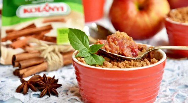 Описание: 🟠 Ягодно-фруктовый крамблАнглийский фруктовый десерт с штрейзельной хрустящей крошкой и сочной, ароматной начинкой.📌 Нужно:🔹 сливочное масло – 80 г🔹 сахар тростниковый – 3 ст.л.🔹 овсяные хлопья – 3 ст.л.🔹 миндаль – 70 г🔹 корица молотая "Kotanyi" – 2 ч.л.🔹 яблоки – 4 шт.🔹 клюква – 100 г🔹 мука – 2 ст.л.🔹 мята – 2 шт.📌 Готовка: 30 мин. (+ 15 мин. доп. времени)🟩 Смолоть овсяные хлопья вместе с орехами. Добавить муку, тростниковый сахар (2 ст.л), молотую корицу и сливочное масло (70 граммов). Перетереть все вместе в штрейзельную крошку.🟩 В сковороде растопить 10 граммов сливочного масла, выложить нарезанные кубиком яблоки. Сверху яблоки посыпать 1 ст.л. тростникового сахара. Всыпать клюкву. Немного потомить яблоки с клюквой на среднем огне. Добавить мелко нарезанную мяту.🟩 Формочки заполнить фруктово-ягодной начинкой. Сверху выложить штрейзельную крошку. Духовку разогреть до 180 градусов. Выпекать крамбл минут 25-30.