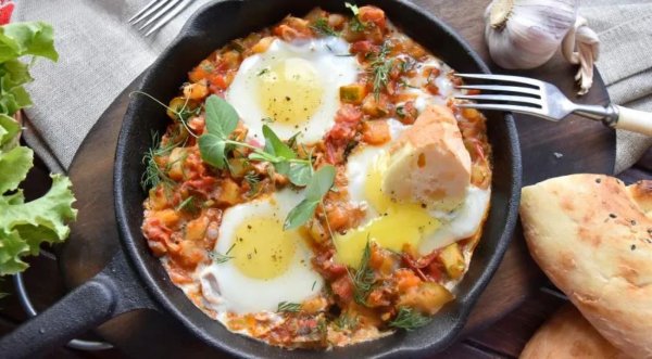 Описание: 🟤 Шакшука с цукини, помидорами и болгарским перцемБлюдо из яиц, жаренных в соусе из томатов, острого и сладкого перца, лукa, чеснока и приправ. Иногда можно отойти от традиционного рецепта и добавить в шакшуку кабачки, кукурузу и даже сосиски.📌 Нужно:🔹 цукини – 1 шт.🔹 помидоры – 3 шт.🔹 зелёный лук – 1 пучок🔹 чеснок – 3 шт.🔹 перец болгарский – 1 шт.🔹 томатная паста – 1 ст.л.🔹 соль – 0,5 ч.л.🔹 зелень – 0,5 пучка🔹 перец чёрный молотый – по вкусу🔹 перец острый– 0,5 шт.🔹 яйца – 3 шт.🔹 масло оливковое – 3 ст.л.📌 Готовка: 15 мин.🟩 Подготовить продукты. Овощи лучше использовать сезонные, выращенные в открытом грунте. Для овощного рагу можно взять всё что вы любите.🟩 Сковороду разогреть, влить растительное масло. Выложить нарезанные лук и измельчённый чеснок. Обжарить до прозрачности.🟩 Следом добавить нарезанные кубиком болгарский перец, немного острого перца и цуккини. Если овощ молодой. не обязательно очищать его от кожуры и семян.🟩 Нарезать кубиком томаты и добавить к овощам. Размешать томатную пасту в 0,5 стакане воды и влить в рагу из овощей. Посолить, поперчить, всыпать специи по вкусу (паприка, базилик, тимьян, орегано).🟩 Накрыть сковороду крышкой и потушить овощи на медленном огне 3-5 минут. Регулируйте степень готовности овощей. Если желаете что бы овощи имели степень готовности аль денте и слегка хрустели, уменьшите время тушения. После того как лишняя влага выпарится, ложкой сформировать небольшие углубления в овощном слое и вбить туда яйца. Довести до готовности, не передержав яйца, чтобы желток остался в жидком состоянии. При подаче посыпать шакшуку измельчённой зеленью