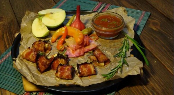 🟦 Крокеты из кролика в беконе с фенхелем, яблоком и розмарином под соусом сацебели