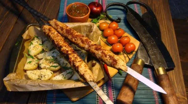 Chicken-бифштекс на шампуре с соусом ткемали и картофелем