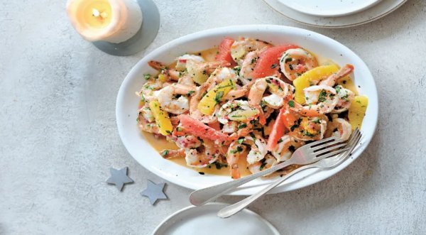 Описание: Сочетание пряных и цитрусовых нот делает этот рецепт особенно вкусным и интересным. Это блюдо легко приготовить, и оно станет отличным украшением любого стола.📌 Нужно:🔹 800 г очищенных креветок🔹 5 зубчиков чеснока🔹 3 апельсина🔹 2 лимона🔹 1 красная луковица🔹 1 грейпфрут🔹 1 ст. л. растительного масла🔹 свежемолотый чёрный перец🔹 небольшой пучок петрушки🔹 соль📌 Готовка: 🔷 Выжмите сок из 2 апельсинов и 1 лимона. С грейпфрута и оставшихся апельсина и лимона срежьте кожуру вместе с белой плёнкой и острым ножом нарежьте фрукты дольками.🔷 Смешайте растительное масло, сок цитрусовых, мелко рубленные чеснок, лук и часть петрушки в большой сковороде и поставьте на средний огонь. После закипания добавьте дольки цитрусовых и готовьте на среднем огне 5-8 мин, пока смесь не выпарится наполовину.🔷 Добавьте креветки, посолите, поперчите и готовьте под крышкой 5 мин. Переложите на блюдо, украсьте оставшейся петрушкой и подавайте теплыми.🔥 СОВЕТ. Как быстро почистить цитрусовые:1. Острым ножом отрежьте верхушки, примерно по 1,5 см с каждой стороны, чтобы была видна мякоть.2. Срезайте кожуру секторами, двигаясь сверху вниз, стараясь оставлять как можно больше мякоти.3. Удалите белую прослойку.4. По контуру дольки сделайте надрезы по обе стороны от неё, прорезая от внешнего края к центру. Отделите дольки.