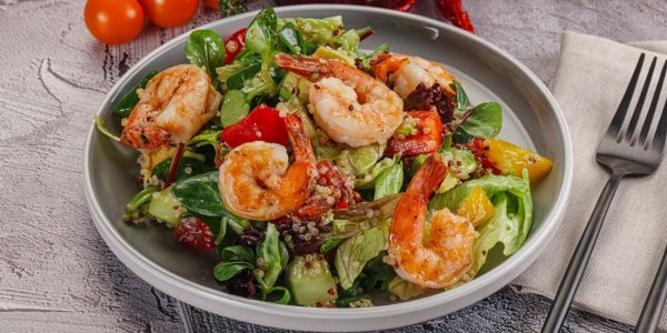 Описание: Этот салат можно подавать с разными заправками, чтобы каждый раз получать новые нотки во вкусе.📌 Нужно:🔹 Киноа (крупа) – 100 г🔹 Чеснок – 2 зубчика🔹 Сливочное масло – 15 г🔹 Очищенные креветки с хвостиками – 350 г🔹 Соль – по вкусу🔹 Молотый чёрный перец – по вкусу🔹 Помидоры красные и жёлтые – 250 г🔹 Крупное авокадо – 1 штука🔹 Салатные листья – 100 г🔹 Оливковое масло – 2 ст. ложки🔹 Лимонный сок – 2 ст. ложки📌 Готовка:🔷 Залейте киноа водой и поставьте вариться на 15-20 минут.🔷 Тем временем измельчите чеснок. Растопите в сковороде масло. Выложите чеснок и креветки и жарьте 3-4 минуты. Посолите и поперчите.🔷 Помидоры и мякоть авокадо нарежьте кусочками.🔷 Выложите в салатник зелень, помидоры, авокадо, креветки и киноа.🔷 Добавьте оливковое масло, лимонный сок, соль и перец. И всё перемешайте.